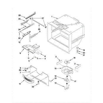 Protective housing that covers refrigerator fan components. Replace if cracked or broken to ensure proper airflow and protection. Confirm fit with model.