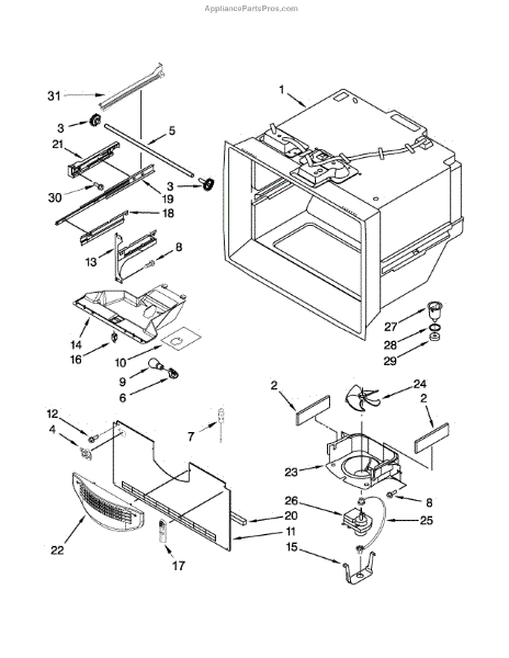 Protective housing that covers refrigerator fan components. Replace if cracked or broken to ensure proper airflow and protection. Confirm fit with model.