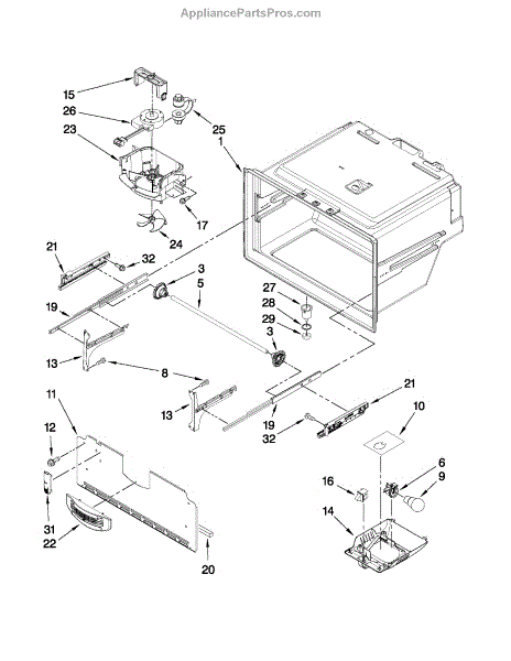 Mounting bracket for bottom-mount refrigerators. Secures internal components in place. Replace if cracked, broken, or missing to restore proper support.