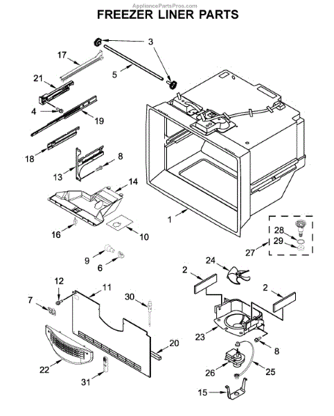 Supports and secures the freezer basket in proper position for smooth sliding. Replace if cracked, broken, or missing to restore basket alignment.