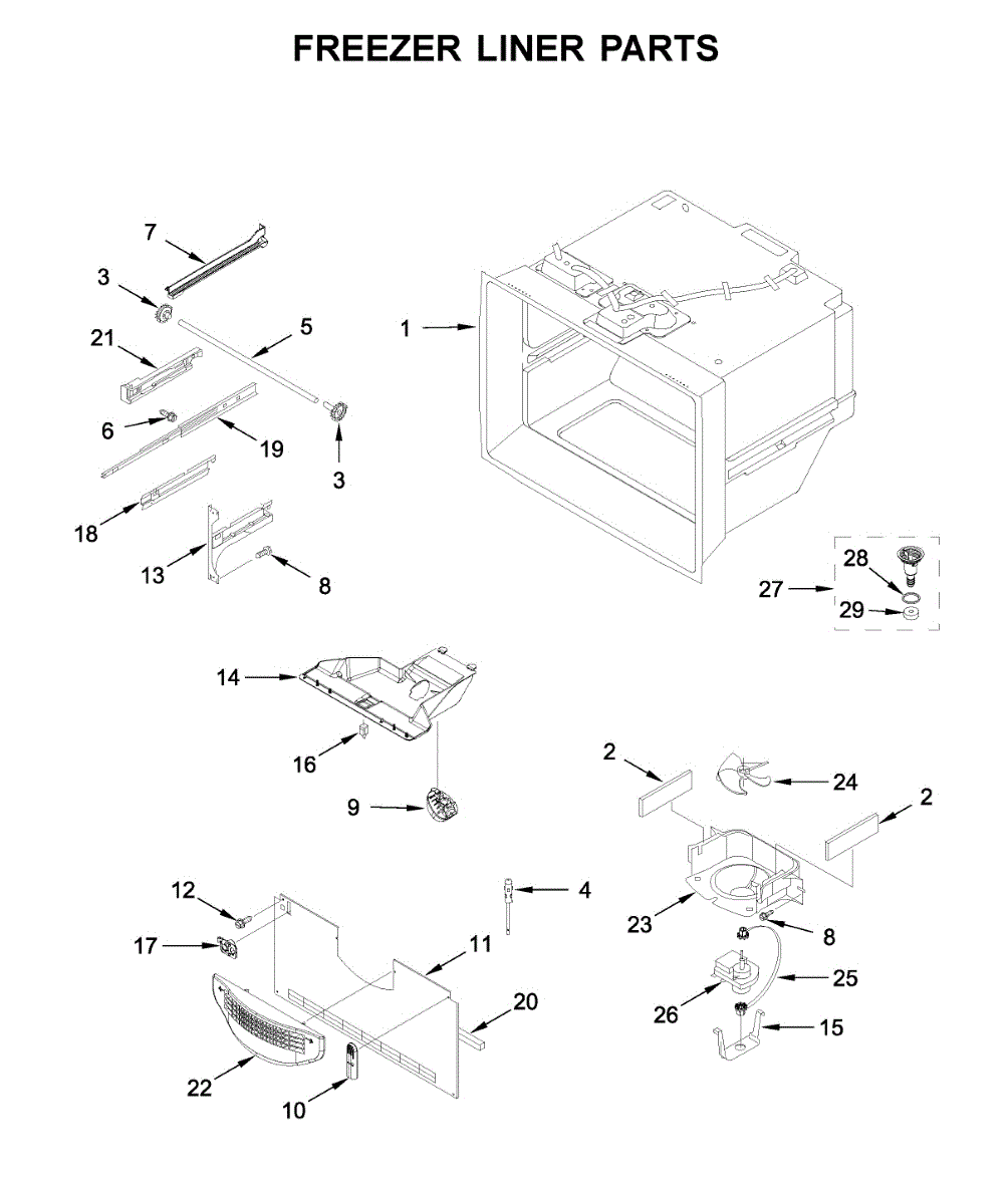 A molded defrost drain funnel that routes condensation and melted frost into the refrigerator's drain to help prevent pooling and interior leaks. Replaces cracked or clogged funnels to restore proper water flow in the drain path. What it does