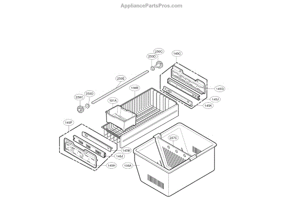 The Freezer Basket is an OEM replacement part for LG French door refrigerators. Located inside the bottom of the freezer compartment, this removable basket provides convenient storage and organization of meats, frozen vegetables, and other bulk items. Causes may involve impact or puncture damage, excessive bending resulting in fractures, or broken retaining tabs that secure the basket in place. Symptoms of a damaged freezer basket include: