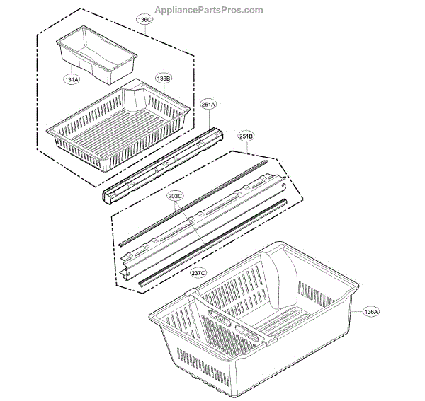 This rail guide assembly restores smooth, reliable drawer movement by guiding and supporting the slide rail. Replaces a worn or broken guide so freezer/refrigerator drawers open and close without sticking or falling off track. What it does