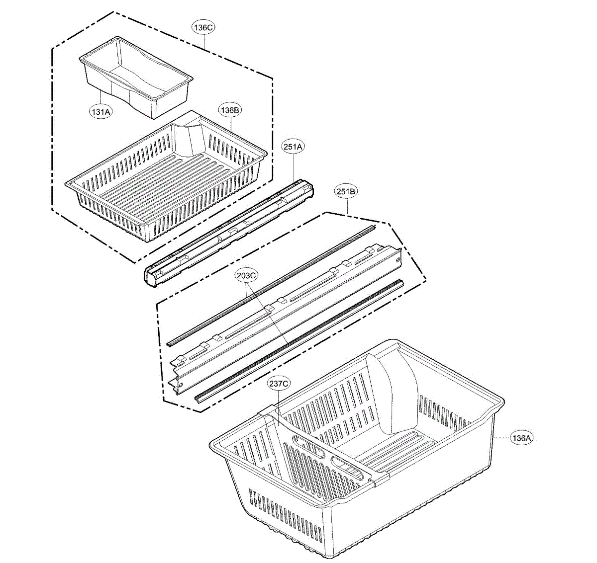This door basket assembly mounts to the refrigerator door to provide secure, convenient storage for bottles, jars, and condiments. Replacing a cracked or loose bin restores usable door storage and helps prevent spills when opening and closing.