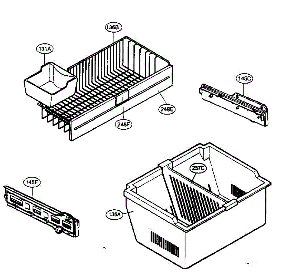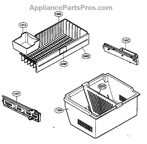 Stores ice from the icemaker inside the freezer compartment. Replace if cracked, warped, or missing to prevent leaks and ice dispensing jams.