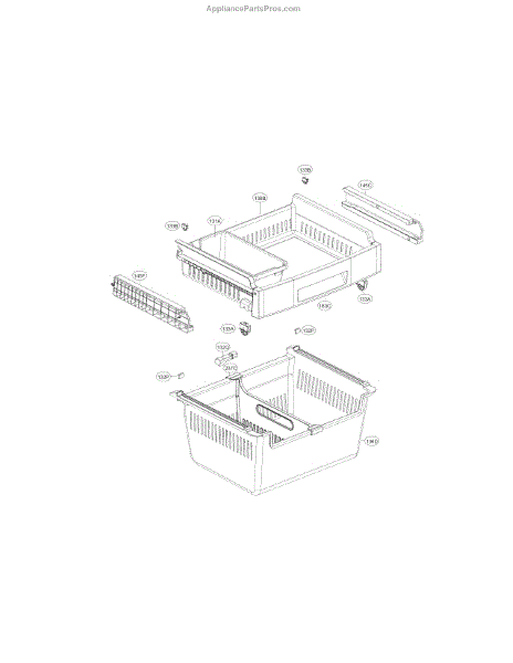 Replacement freezer drawer tray for bottom-mount refrigerators. Organizes frozen foods inside pull-out compartment. Replace if cracked, broken, or warped.