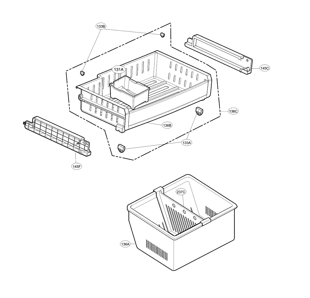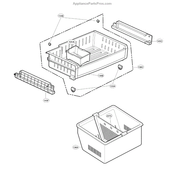 The Freezer Basket is an OEM replacement part for LG French door refrigerators. Located inside the bottom of the freezer compartment, this removable basket provides convenient storage and organization of meats, frozen vegetables, and other bulk items. Causes may involve impact or puncture damage, excessive bending resulting in fractures, or broken retaining tabs that secure the basket in place. Symptoms of a damaged freezer basket include: