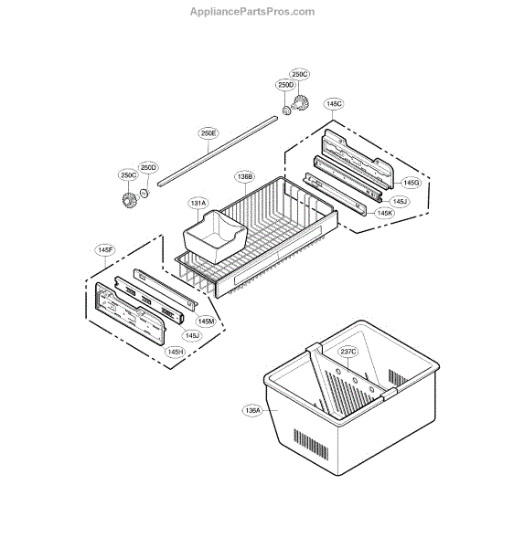 This guide assembly supports and guides freezer/refrigerator drawers for smooth opening and closing. It replaces worn or damaged rails to restore proper drawer alignment and reduce sticking or uneven movement. What it does: