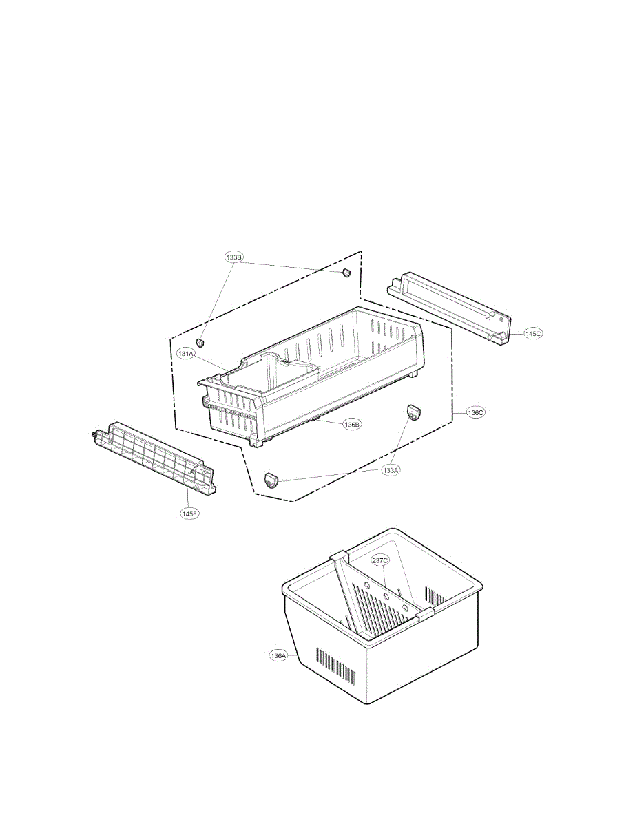 The Freezer Basket is an OEM replacement part for LG French door refrigerators. Located inside the bottom of the freezer compartment, this removable basket provides convenient storage and organization of meats, frozen vegetables, and other bulk items. Causes may involve impact or puncture damage, excessive bending resulting in fractures, or broken retaining tabs that secure the basket in place. Symptoms of a damaged freezer basket include: