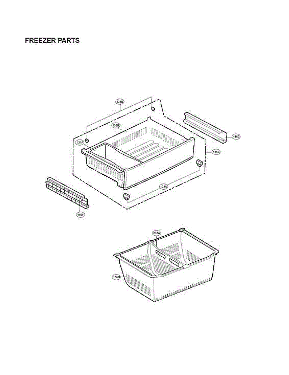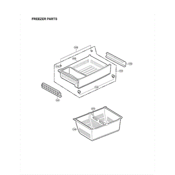 Door basket assembly for LG refrigerators. Mounts inside refrigerator door to organize and store items. Replace if cracked, broken, or damaged from wear.