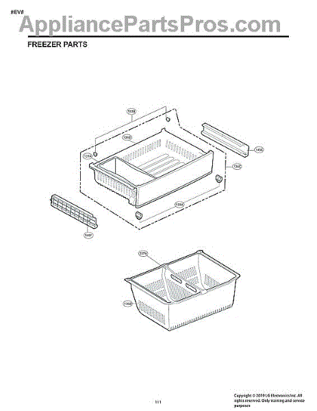 This is an ice bucket assembly that is used on refrigerator and freezer units. This part stores the ice that has been made so that it can be dispensed. The auger is attached to this, which is the piece that moves the ice into the dispenser chute. Additional parts may also be included with this component.Over time, the bucket assembly may begin to crack or break. This can happen due to exposure to extreme temperatures over time. If this is the case, it will need to be replaced. If the auger itself is no longer working, the whole ice bucket assembly will need to be replaced because it is attached. Wear work gloves when replacing this part.This ice bucket is compatible with refrigerator and freezer units that have been manufactured by Kenmore Elite and LG. It is sold individually. This part is sourced straight from the manufacturer.