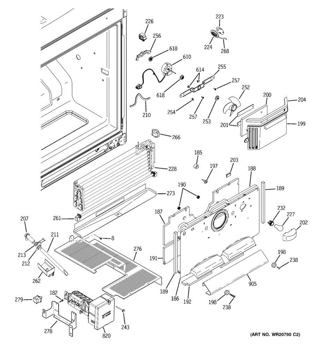 Secures the evaporator fan assembly behind the rear freezer panel. Replace if cracked, rusted, or missing to restore proper fan mounting and clearance.