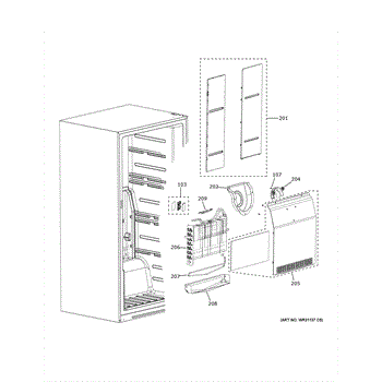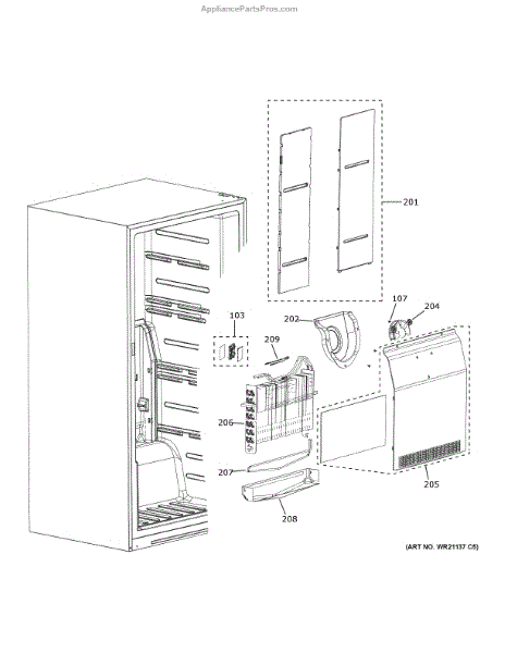 The Evaporator Fan Shroud is an OEM replacement part for GE refrigerators. It is responsible for directing airflow and ensuring proper circulation in the freezer compartment.