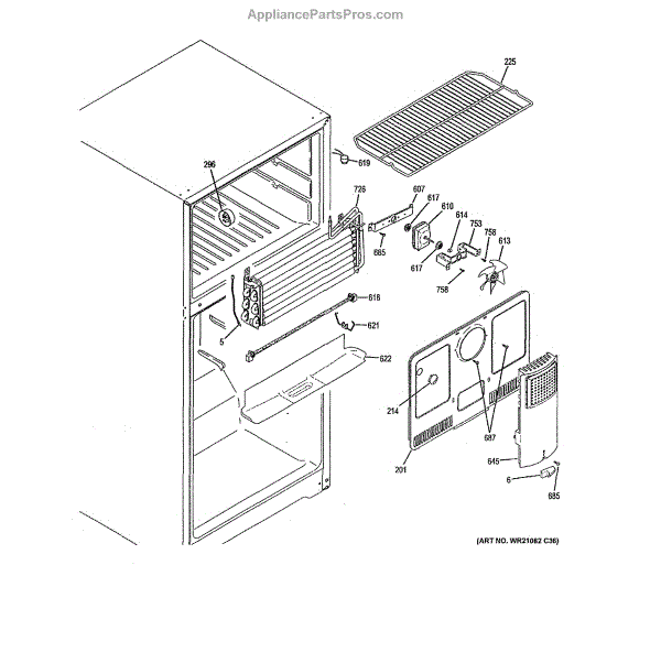 The Evaporator fan front bracket is an OEM replacement part for GE refrigerators. Located inside the freezer compartment, this bracket securely mounts and supports the evaporator fan assembly. Causes of a bad front bracket include breakage from repeated fan motion, cracking from temperature fluctuations over many years, or loosening of mounting points. Symptoms of a bad evaporator fan front bracket include: