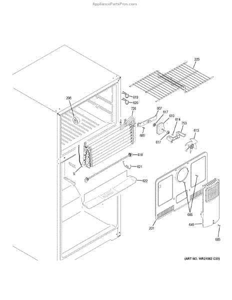 The Evaporator fan front bracket is an OEM replacement part for GE refrigerators. Located inside the freezer compartment, this bracket securely mounts and supports the evaporator fan assembly. Causes of a bad front bracket include breakage from repeated fan motion, cracking from temperature fluctuations over many years, or loosening of mounting points. Symptoms of a bad evaporator fan front bracket include: