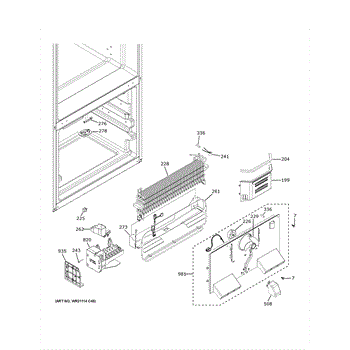 Evaporator cover and fan assembly for refrigerators. Installs in the freezer compartment. Replace if cracked, broken, or missing components.