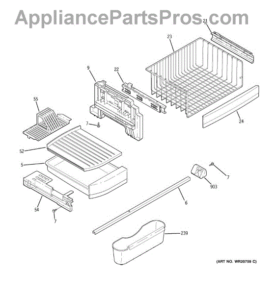 This upper drawer slide assembly supports and guides a refrigerator bin beneath its shelf. Replacing a cracked or worn slide restores smooth, aligned drawer movement so the bin opens and closes easily without binding or sagging.