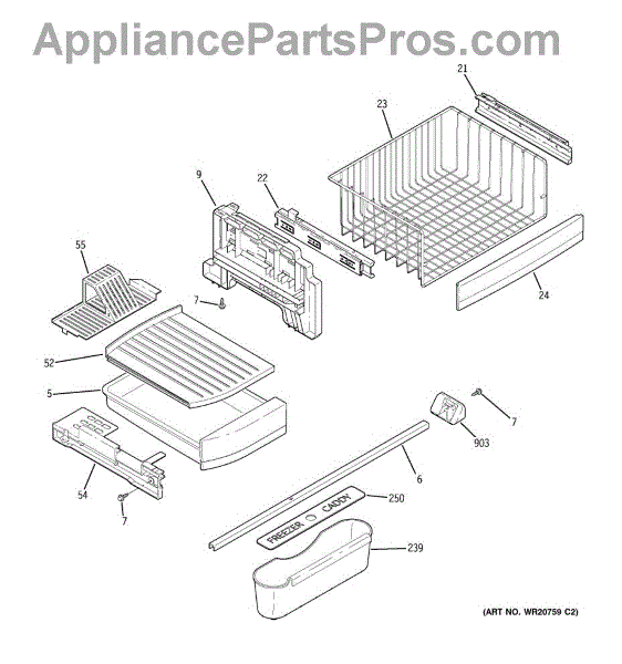This upper drawer slide assembly supports and guides a refrigerator bin beneath its shelf. Replacing a cracked or worn slide restores smooth, aligned drawer movement so the bin opens and closes easily without binding or sagging.