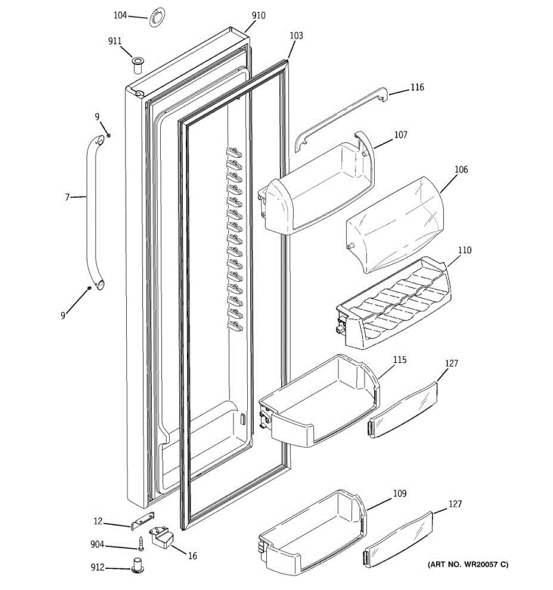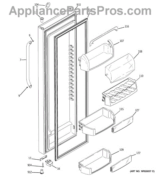 The Door Bin is an OEM part for GE refrigerators. It is a convenient storage compartment located on the interior of the refrigerator door, designed to hold and organize smaller items such as condiments, jars, or beverages.