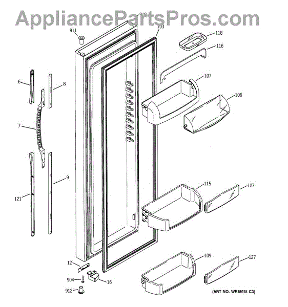 The Door Bin is an OEM part for GE refrigerators. It is a convenient storage compartment located on the interior of the refrigerator door, designed to hold and organize smaller items such as condiments, jars, or beverages.