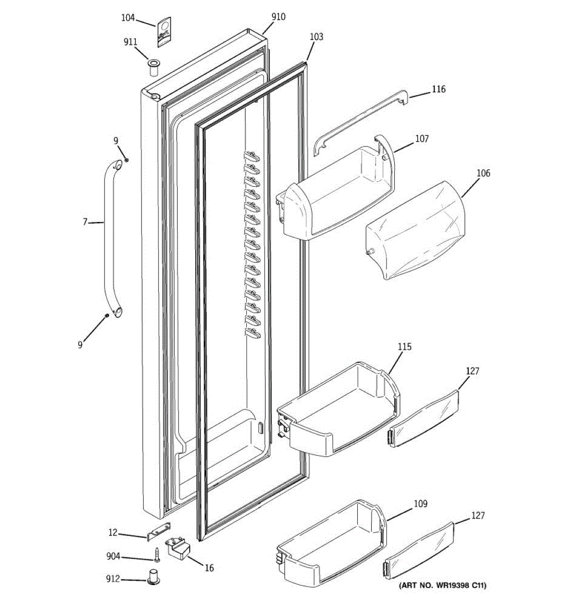 The Door Bin is an OEM part for GE refrigerators. It is a convenient storage compartment located on the interior of the refrigerator door, designed to hold and organize smaller items such as condiments, jars, or beverages.