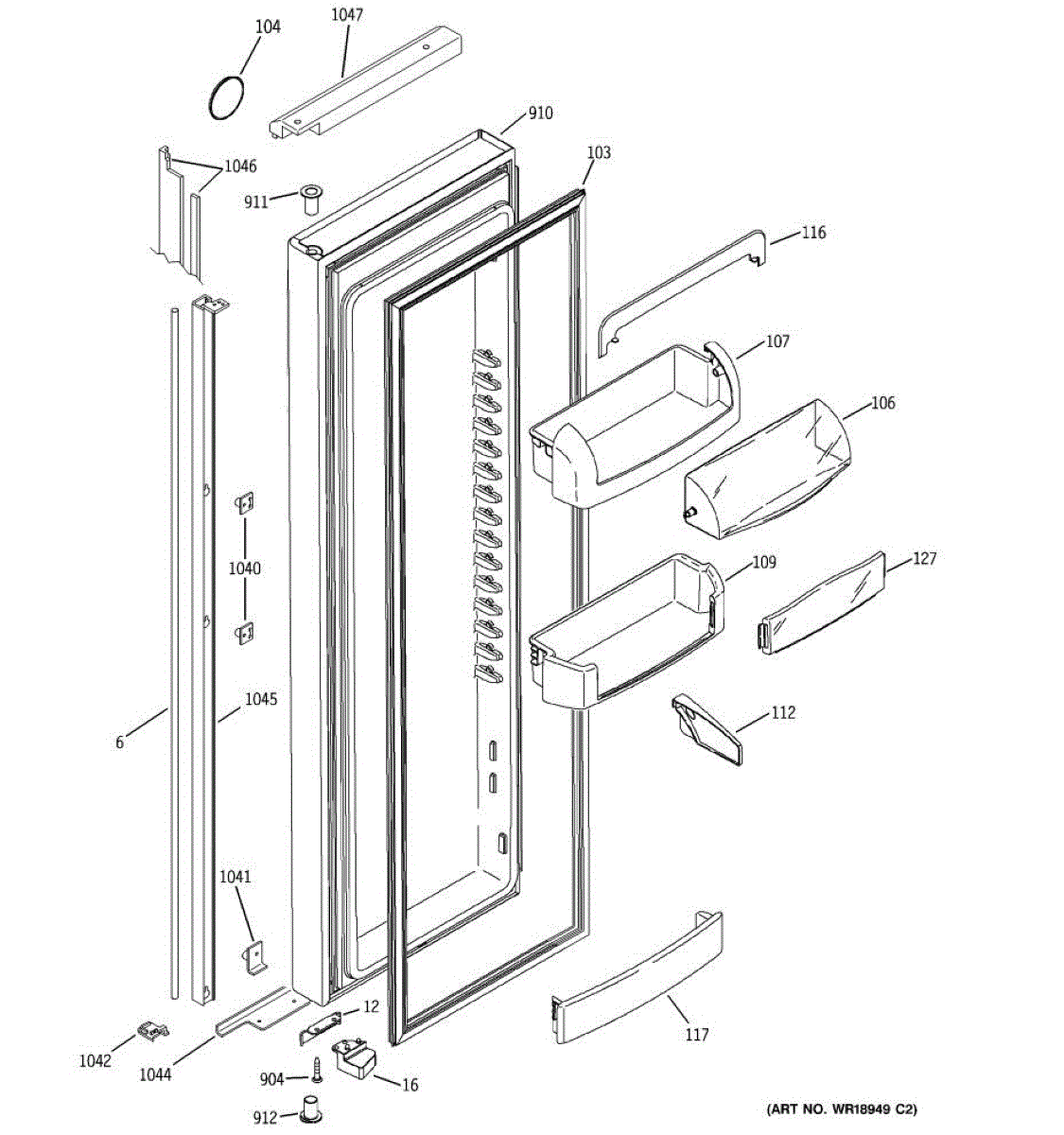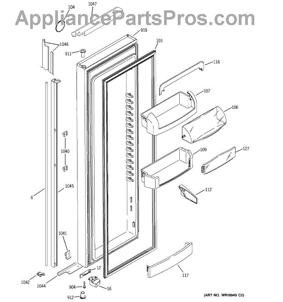 The Door Bin is an OEM part for GE refrigerators. It is a convenient storage compartment located on the interior of the refrigerator door, designed to hold and organize smaller items such as condiments, jars, or beverages.
