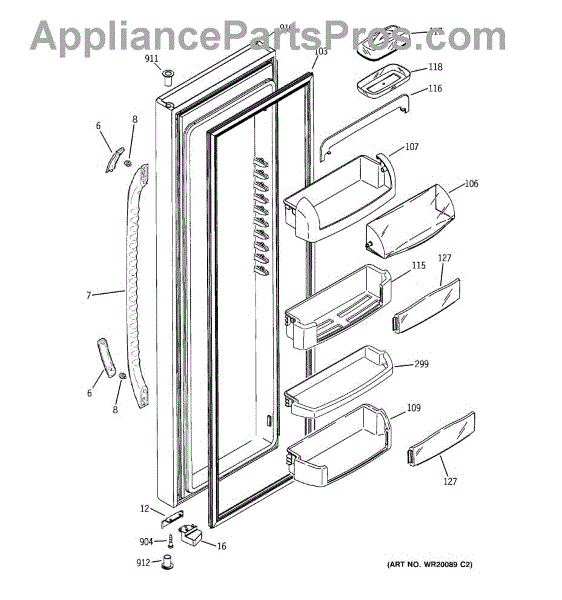 The Door Bin is an OEM part for GE refrigerators. It is a convenient storage compartment located on the interior of the refrigerator door, designed to hold and organize smaller items such as condiments, jars, or beverages.