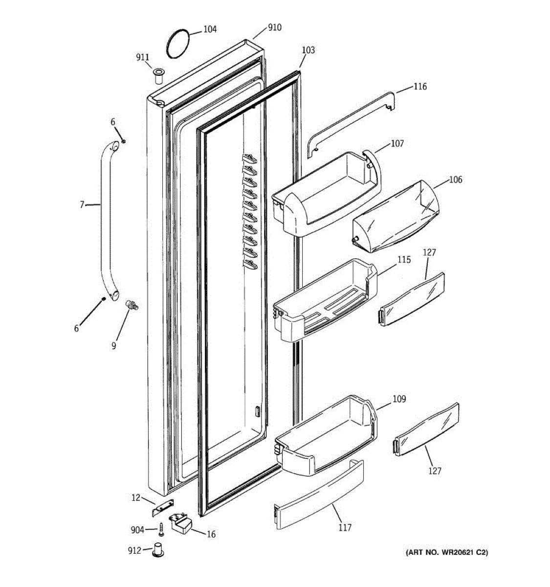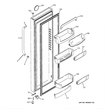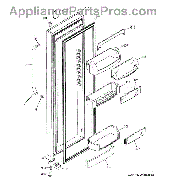 The Door Bin is an OEM part for GE refrigerators. It is a convenient storage compartment located on the interior of the refrigerator door, designed to hold and organize smaller items such as condiments, jars, or beverages.