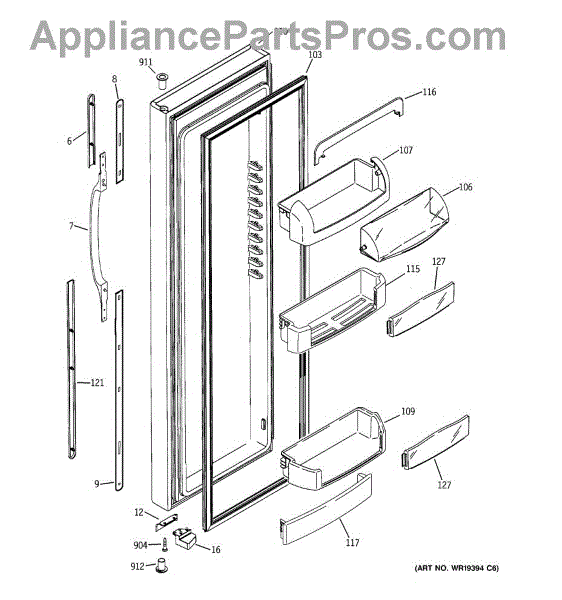 The Door Bin is an OEM part for GE refrigerators. It is a convenient storage compartment located on the interior of the refrigerator door, designed to hold and organize smaller items such as condiments, jars, or beverages.