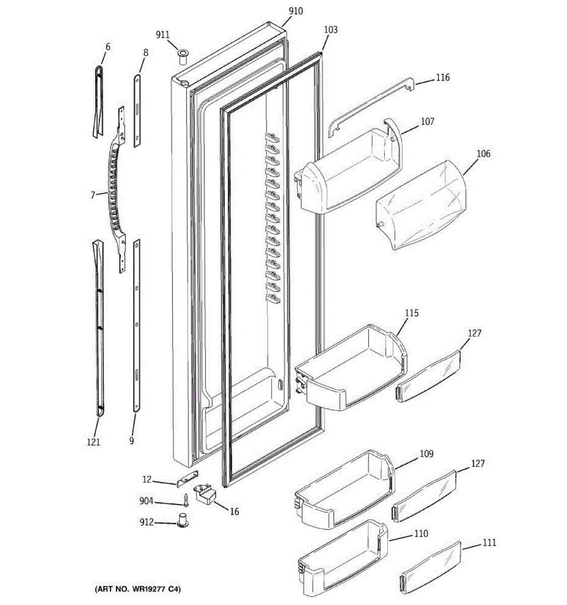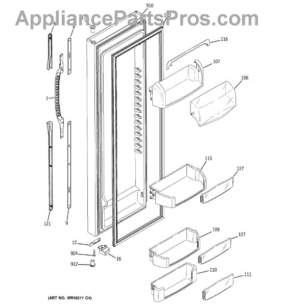 The Door Bin is an OEM part for GE refrigerators. It is a convenient storage compartment located on the interior of the refrigerator door, designed to hold and organize smaller items such as condiments, jars, or beverages.