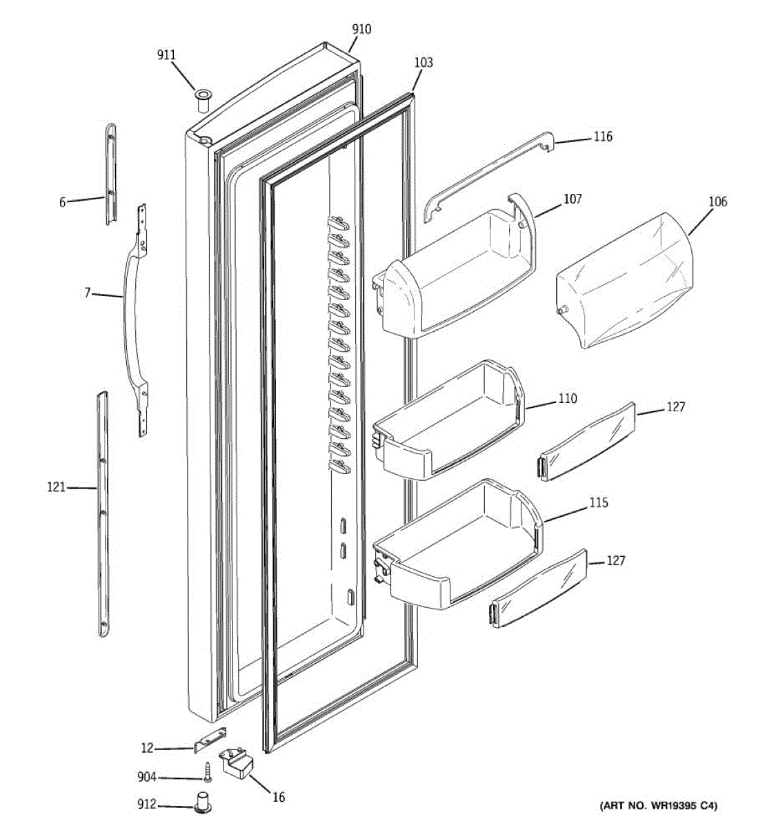 The Door Bin is an OEM part for GE refrigerators. It is a convenient storage compartment located on the interior of the refrigerator door, designed to hold and organize smaller items such as condiments, jars, or beverages.