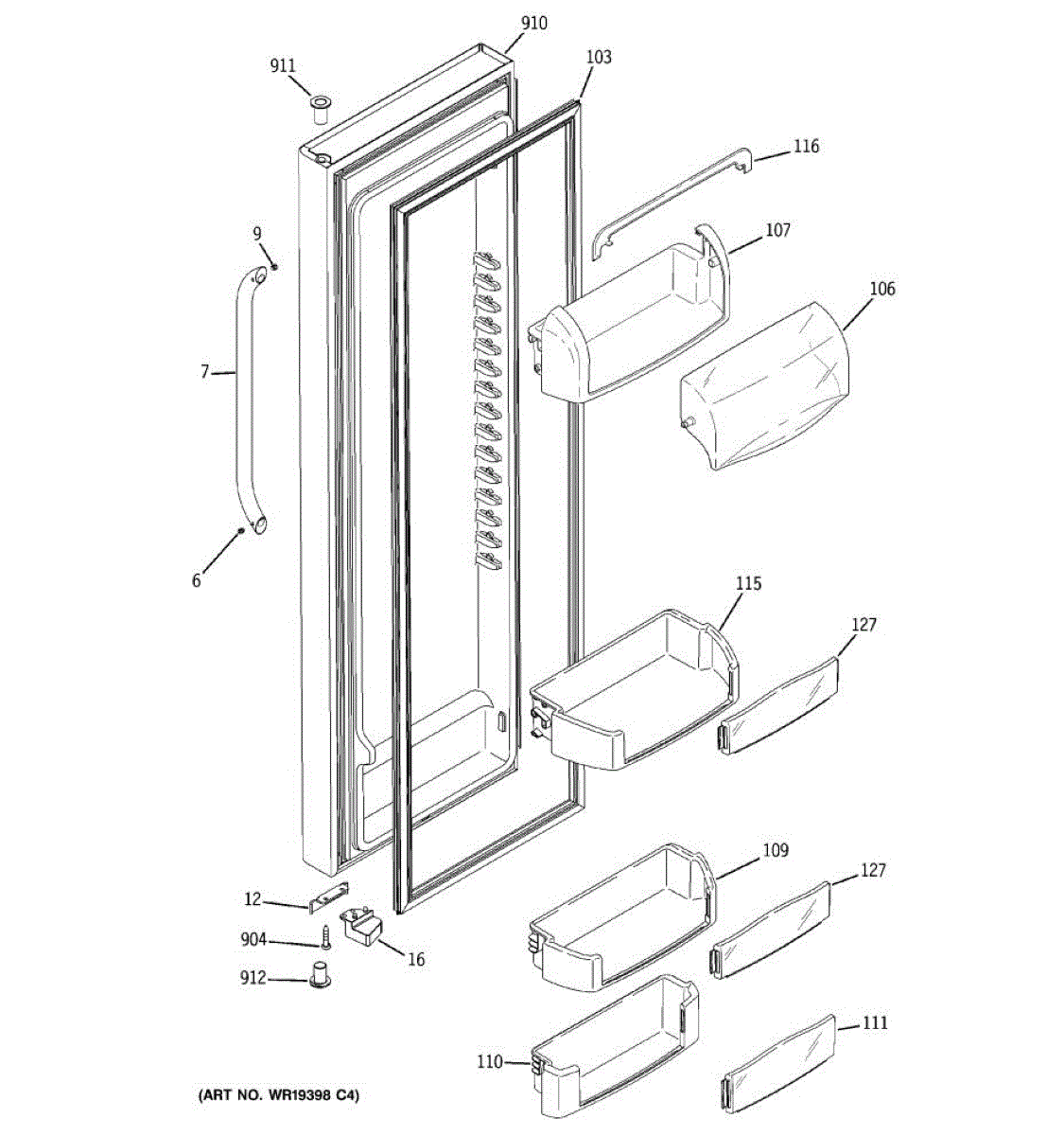 The Door Bin is an OEM part for GE refrigerators. It is a convenient storage compartment located on the interior of the refrigerator door, designed to hold and organize smaller items such as condiments, jars, or beverages.