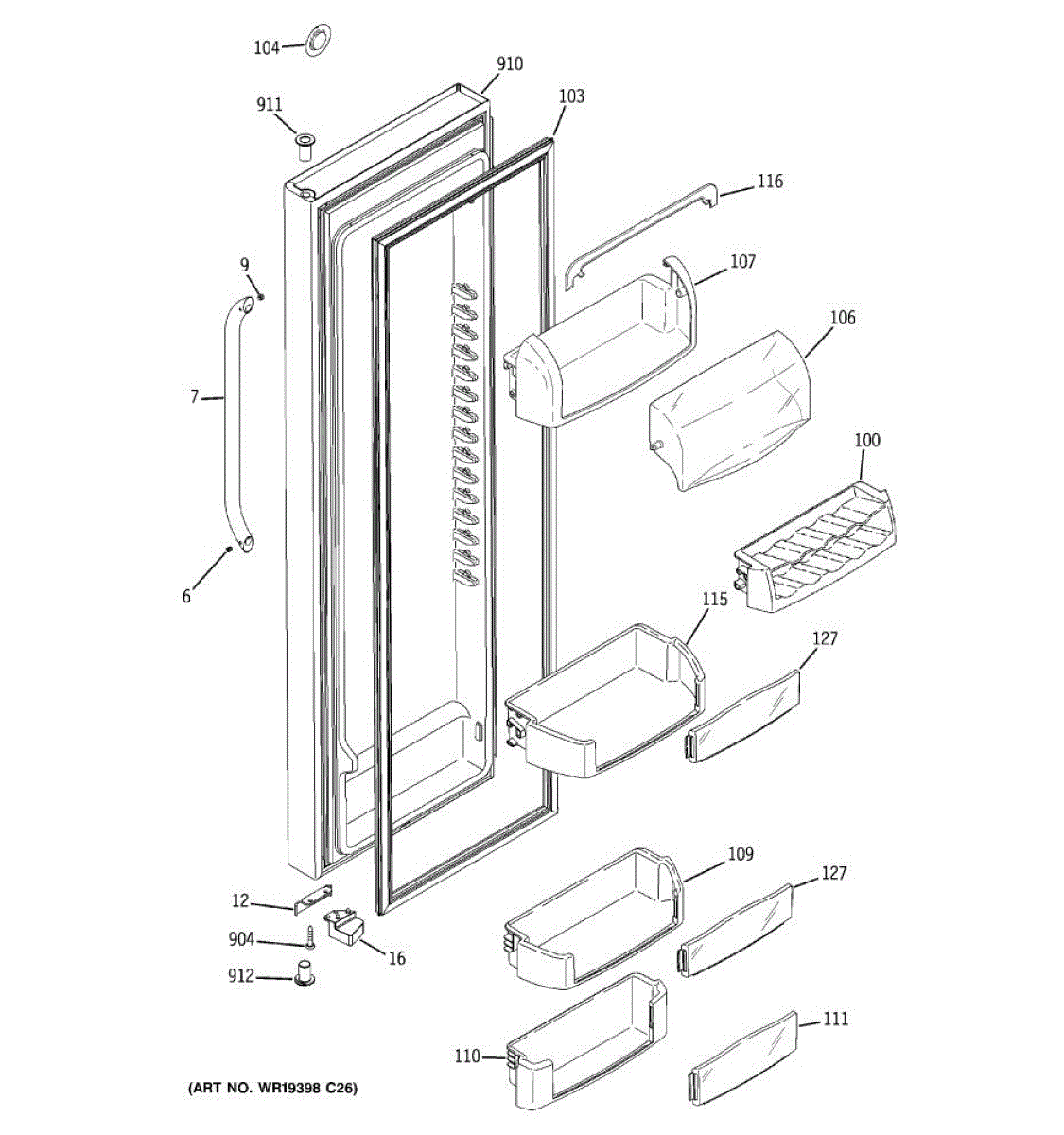 The Door Bin is an OEM part for GE refrigerators. It is a convenient storage compartment located on the interior of the refrigerator door, designed to hold and organize smaller items such as condiments, jars, or beverages.