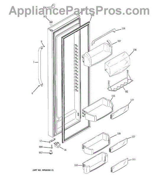 The Door Bin is an OEM part for GE refrigerators. It is a convenient storage compartment located on the interior of the refrigerator door, designed to hold and organize smaller items such as condiments, jars, or beverages.