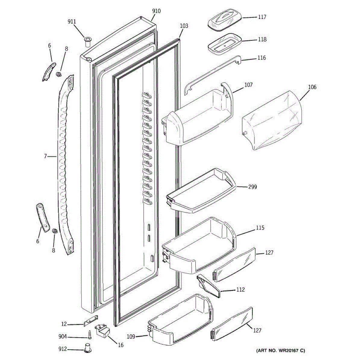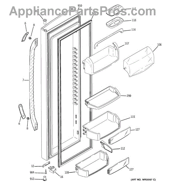 The Door Bin is an OEM part for GE refrigerators. It is a convenient storage compartment located on the interior of the refrigerator door, designed to hold and organize smaller items such as condiments, jars, or beverages.