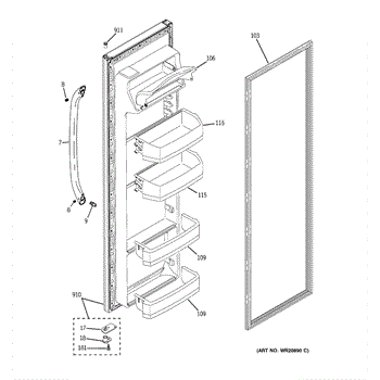 Replacement door bin for side-by-side refrigerators. Installs on the inner door to store condiments, bottles, and jars. Replace if cracked or broken.