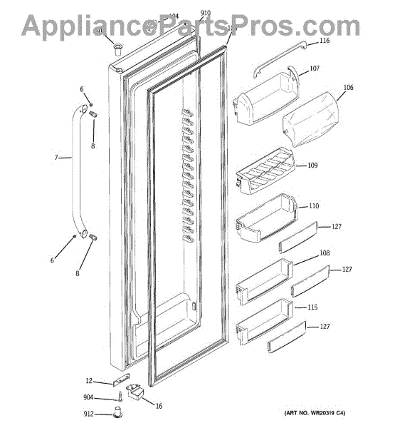 The Door Bin is an OEM part for GE refrigerators. It is a convenient storage compartment located on the interior of the refrigerator door, designed to hold and organize smaller items such as condiments, jars, or beverages.