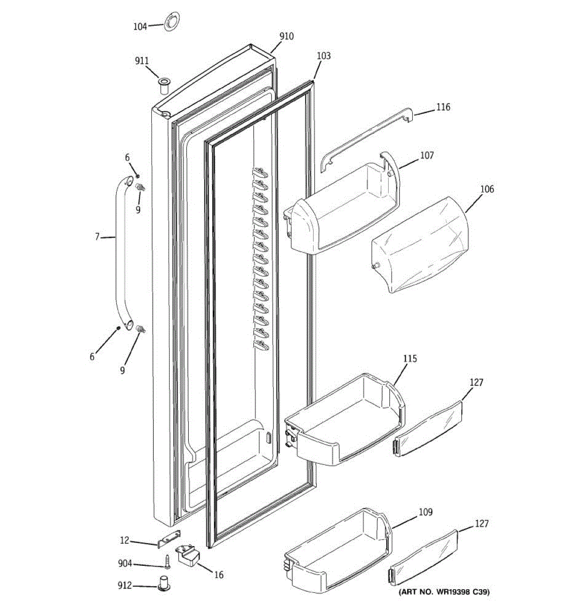 The Door Bin is an OEM part for GE refrigerators. It is a convenient storage compartment located on the interior of the refrigerator door, designed to hold and organize smaller items such as condiments, jars, or beverages.