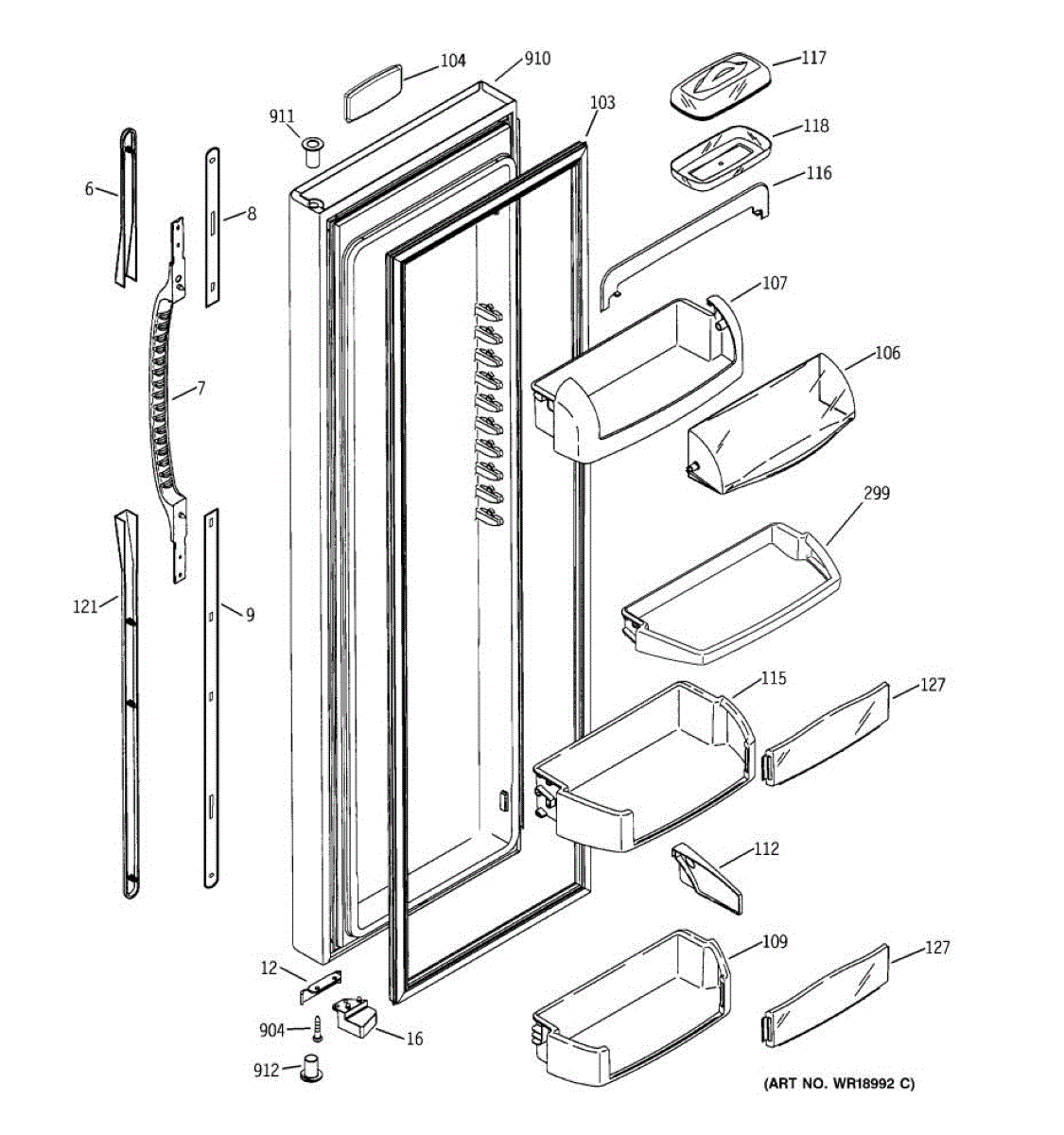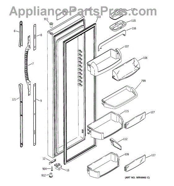 The Door Bin is an OEM part for GE refrigerators. It is a convenient storage compartment located on the interior of the refrigerator door, designed to hold and organize smaller items such as condiments, jars, or beverages.