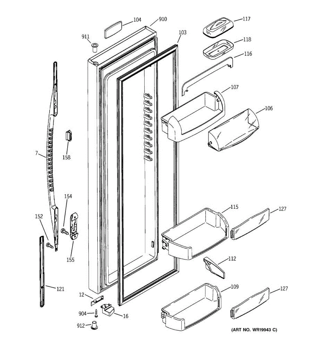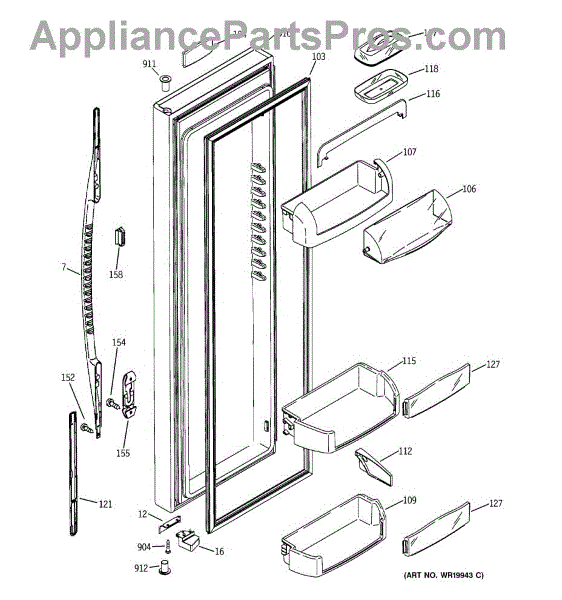 The Door Bin is an OEM part for GE refrigerators. It is a convenient storage compartment located on the interior of the refrigerator door, designed to hold and organize smaller items such as condiments, jars, or beverages.