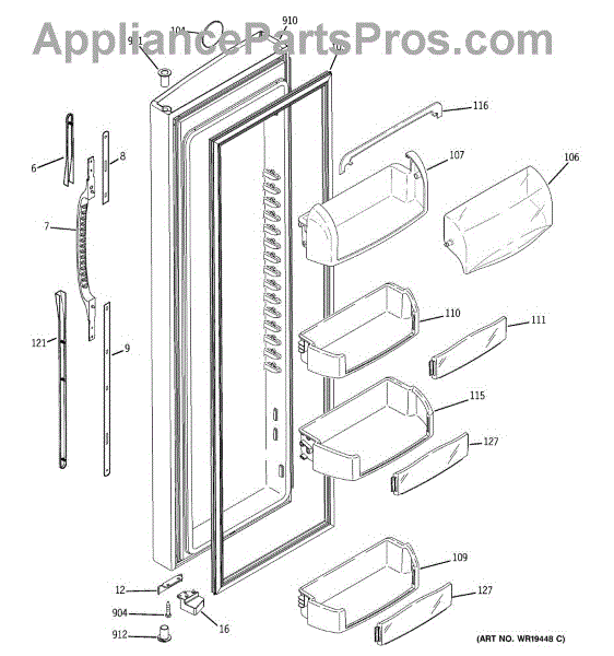 Replacement door bin for side-by-side refrigerators. Mounts inside the door to organize condiments, jars, and beverages. Replace if cracked or broken.