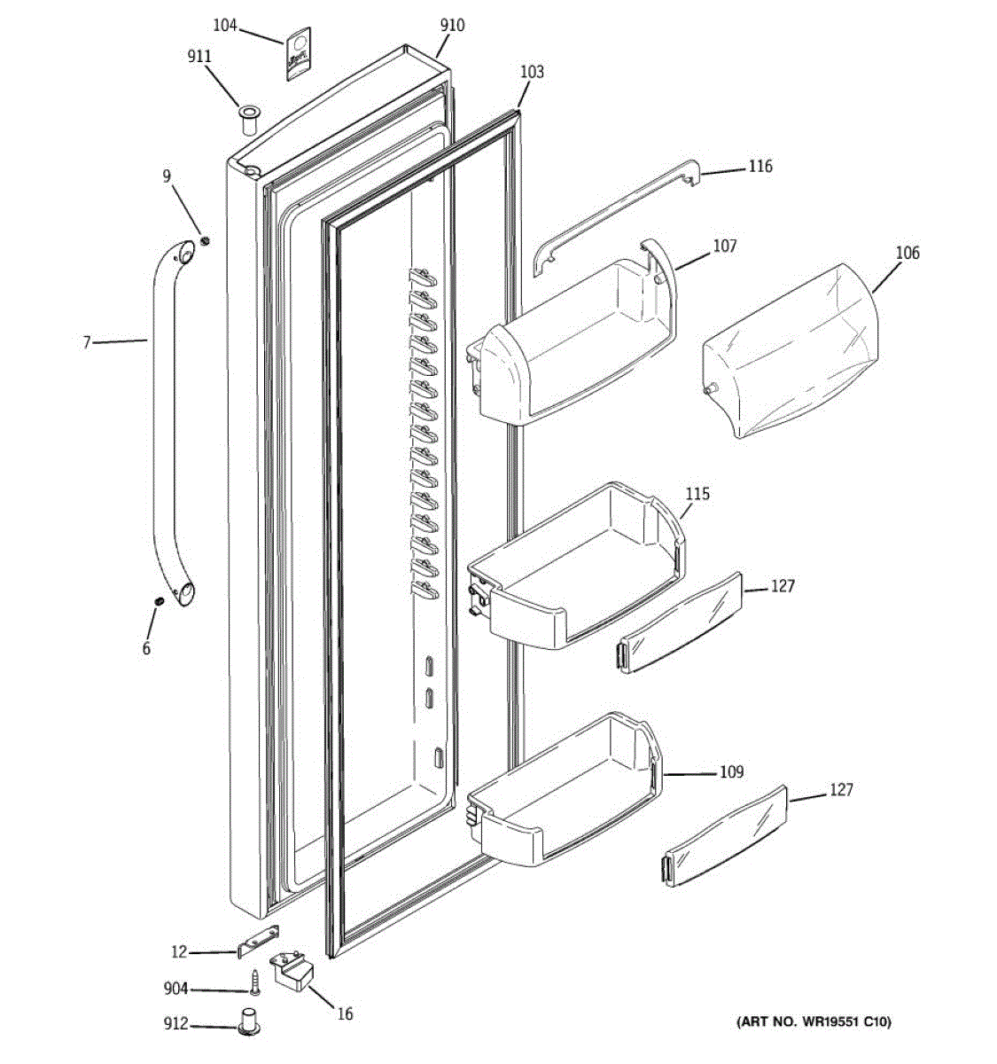 The Door Bin is an OEM part for GE refrigerators. It is a convenient storage compartment located on the interior of the refrigerator door, designed to hold and organize smaller items such as condiments, jars, or beverages.