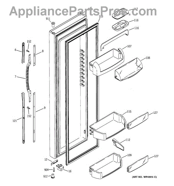 The Door Bin is an OEM part for GE refrigerators. It is a convenient storage compartment located on the interior of the refrigerator door, designed to hold and organize smaller items such as condiments, jars, or beverages.