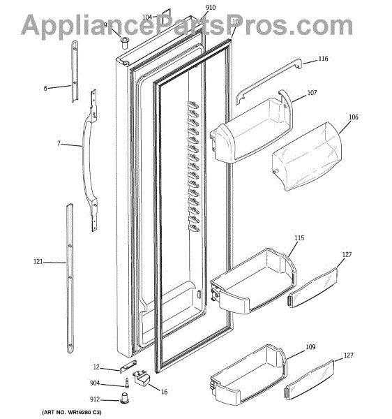 The Door Bin is an OEM part for GE refrigerators. It is a convenient storage compartment located on the interior of the refrigerator door, designed to hold and organize smaller items such as condiments, jars, or beverages.