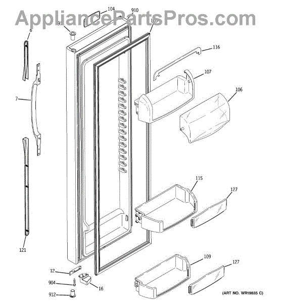 The Door Bin is an OEM part for GE refrigerators. It is a convenient storage compartment located on the interior of the refrigerator door, designed to hold and organize smaller items such as condiments, jars, or beverages.