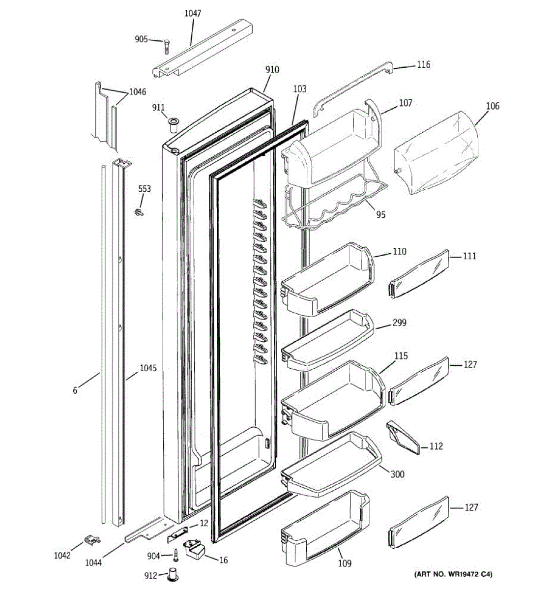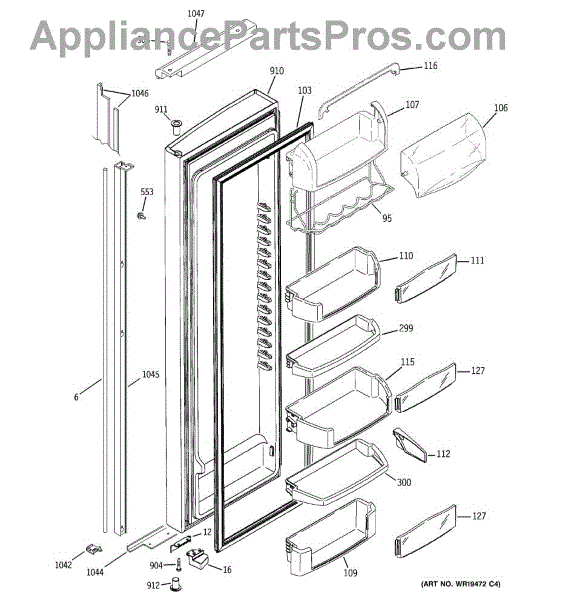 The Door Bin is an OEM part for GE refrigerators. It is a convenient storage compartment located on the interior of the refrigerator door, designed to hold and organize smaller items such as condiments, jars, or beverages.