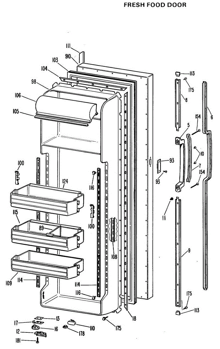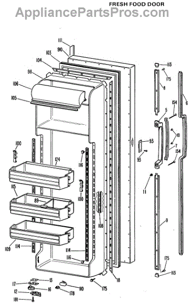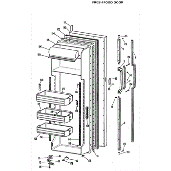 Removable door bin assembly for side-by-side refrigerators. Replaces cracked, broken, or missing door shelves. Mounts inside refrigerator door.