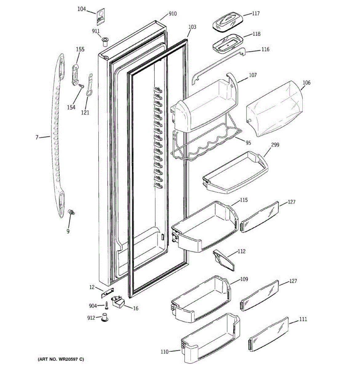 The Door Bin is an OEM part for GE refrigerators. It is a convenient storage compartment located on the interior of the refrigerator door, designed to hold and organize smaller items such as condiments, jars, or beverages.