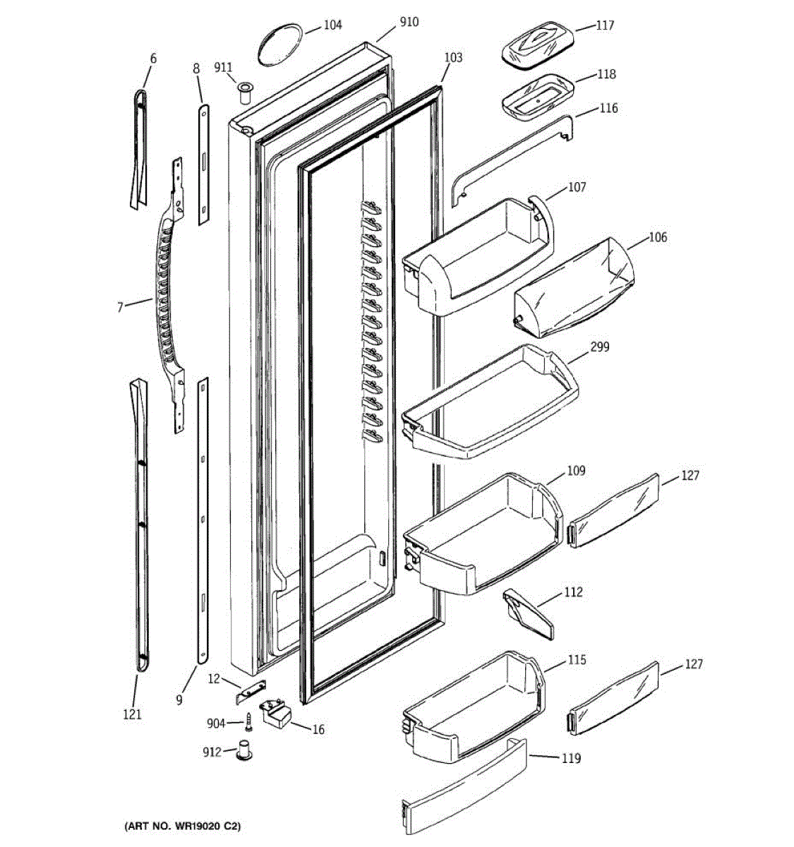 The Door Bin is an OEM part for GE refrigerators. It is a convenient storage compartment located on the interior of the refrigerator door, designed to hold and organize smaller items such as condiments, jars, or beverages.