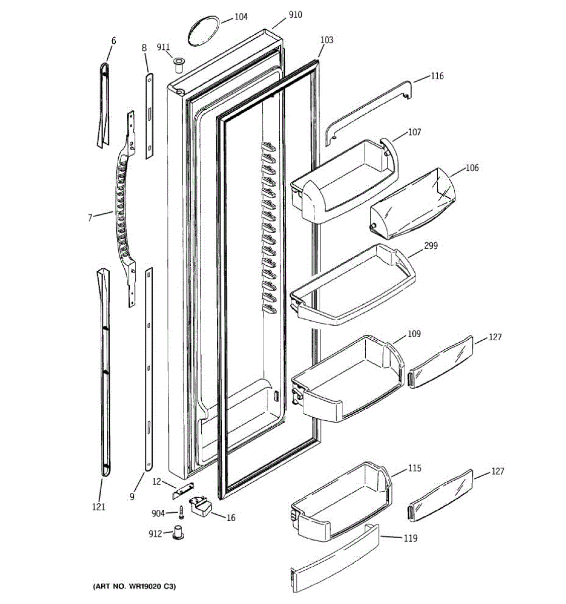 The Door Bin is an OEM part for GE refrigerators. It is a convenient storage compartment located on the interior of the refrigerator door, designed to hold and organize smaller items such as condiments, jars, or beverages.